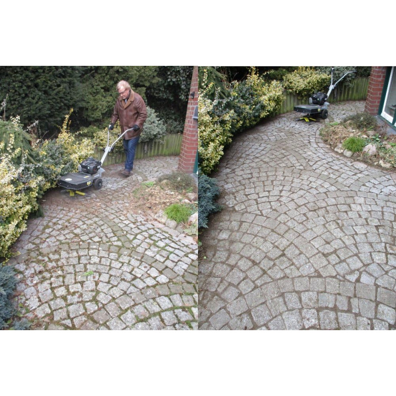 Efektīvi notīriet flīzes un akmens virsmas, neizmantojot ķimikālijas, gāzes degļus vai augstspiediena mazgātājus. Greenbuster Home 550 tērauda birstes noņem nevēlamās nezāles no bruģa spraugām, gājēju celiņiem, piebraucamiem ceļiem, ietvēm, stāvvietām. Ja nepieciešams, pirms darba uzsākšanas virsmu aplaistiet ar ūdeni, tas ļaus izvairīties no nevajadzīgiem putekļiem. Sukas galvas rotācija ir optimizēta, lai iegūtu vislabākos rezultātus. Tajā pašā laikā ātrums nodrošina, ka akmeņi, nezāles un putekļi netiek aizmesti tālu. Iekārta ir aprīkota ar četriem triju ļoti jaudīgu tērauda suku komplektiem, kas efektīvi noņem nezāles un sūnas.